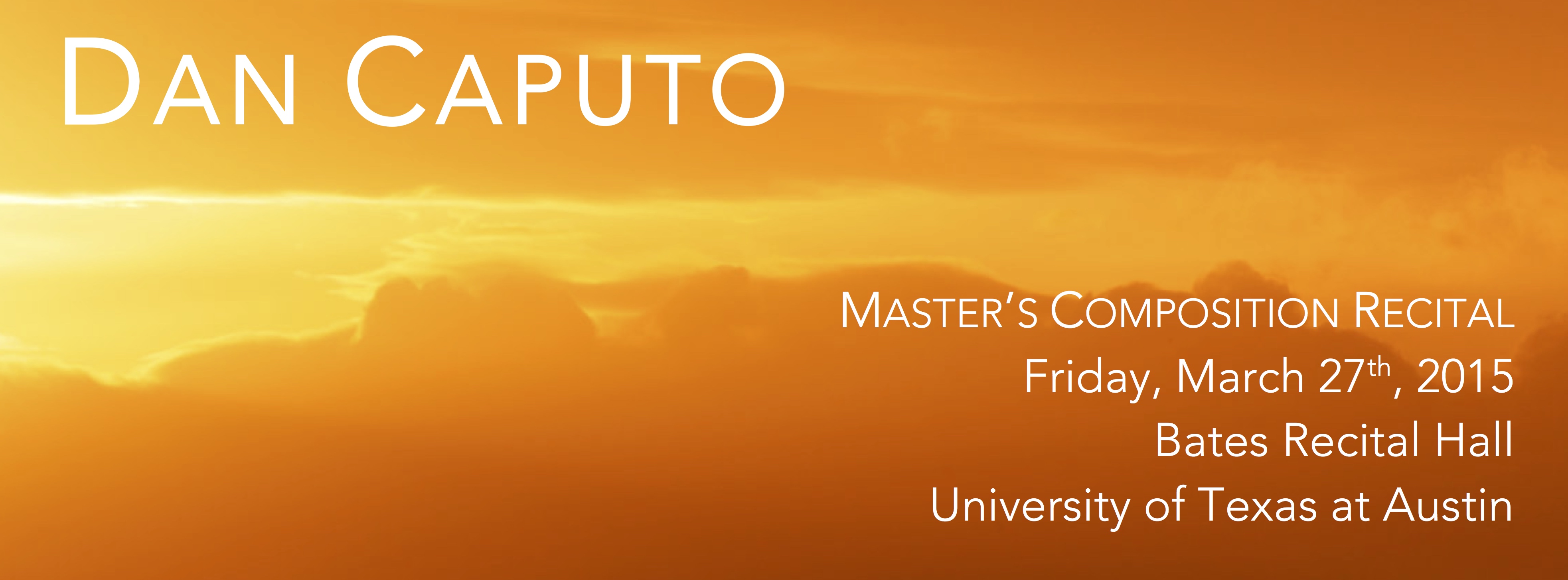 Join me on Friday, March 27th as I present works composed during my two years at the University of Texas at Austin! Included on the program will be Rhízōma for percussion quartet (2014), Southwest Landscapes for Clarinet and Bassoon (2014), and To My Soul for baritone and chamber ensemble (2013); additionally the concert will feature three works for fixed electronic media. The recital will be held in Bates Recital Hall on UT Austin’s campus.