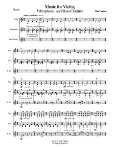 Music for Violin, Vibraphone, and Bass Clarinet contrasts rhythmically energetic music with stagnant musical meditation through its arcing form. The music opens with a repeated rhythmic phrase in flowing meters; melodies develop as the music builds and dissipates energy before reaching a spacious meditation on sustained chords. This music arrives at its own climax before returning to previous rhythmic motives and an extended crescendo to finish off the piece. Scored for the ensemble in the title, the work lasts approximately 6 minutes.